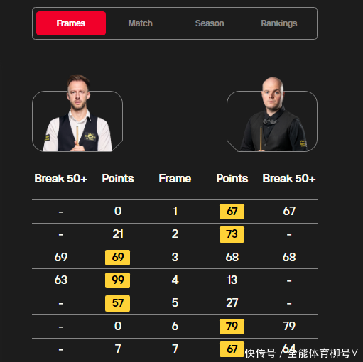 这场比赛一开局,埃利奥特强势发力,得到3-0寥落上风,特鲁姆普随后连扳两局追成2-2平局,前四局的比分为:67(67)-0、73-21、(68)-69(69)、13-99(63)。