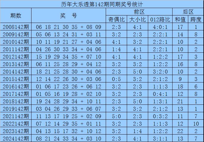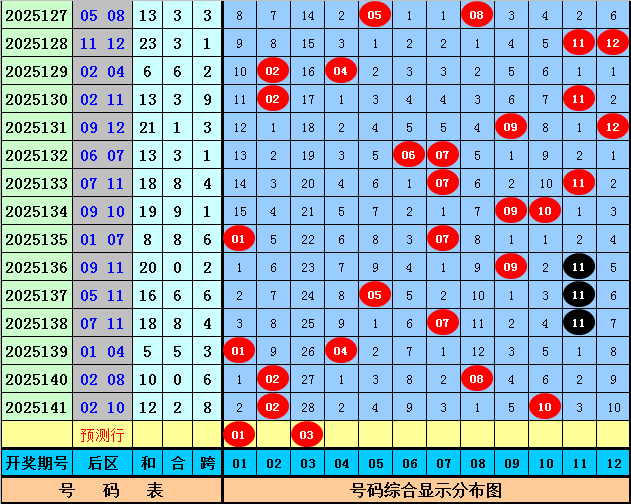 后离别析:在第142期历史同时开奖中,和值大小为7:9,跨度奇偶比为7:9,本期后区留心两码01和03。