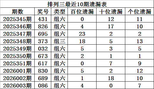上期牵记:摆设三第2026003期奖号:086,组六,直选遗漏总值为11期。